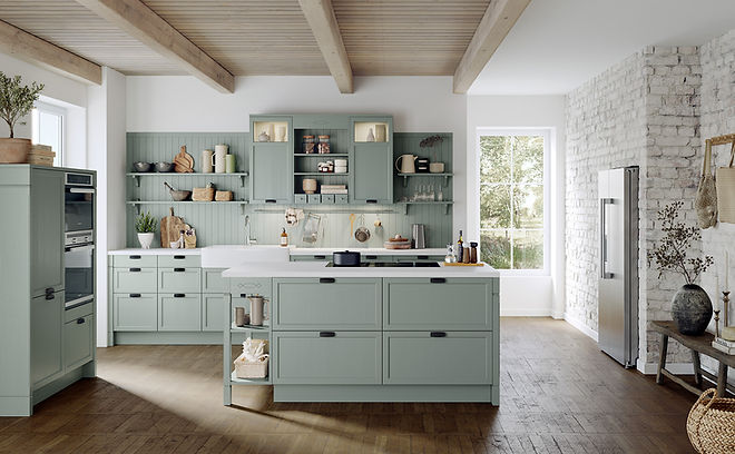 A traditional country-style kitchen. Comfortable living is the order of the day here. The new shade of eucalyptus ensures freshness and naturalness. A smart choice: white as a partner. Selected accessories can be beautifully presented on the open kitchen shelves. The kitchen island is practical and visually separates the kitchen from the adjoining living room.
